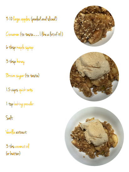 Now, with fifty apples sitting on our countertop, I was forced to sit down and make a list of apple recipes: apple pancakes, oatmeal, muffins, cookies, and our favorite, apple crisp. I came up with a low sugar, low fat recipe that is perfect for chilly Fall nights to come. Added perk? The recipe is packed with oats, a breast milk booster.