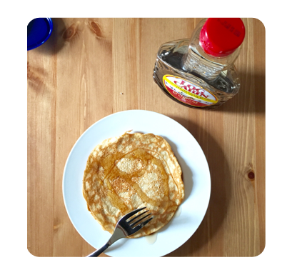 Blend all ingredients in a food processor until smooth — pour batter one scoop at a time (smaller scoops for “crêpe-like” pancakes, as pictured above) in a sprayed pan. 2 minutes per side on medium heat. Serve with maple syrup… preferably without any high fructose corn syrup (read this article on why HFCS will kill you.)